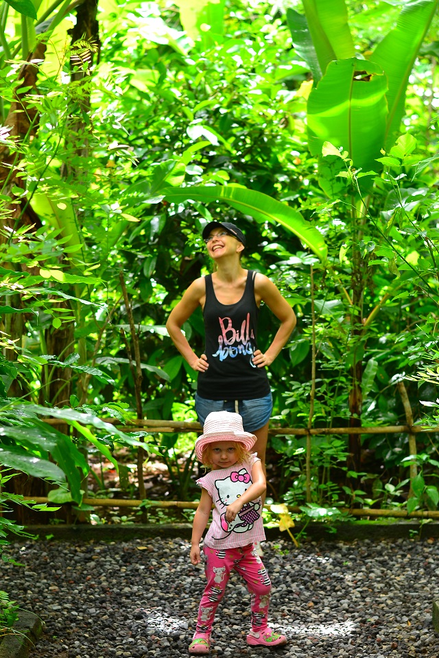 Pod asub meist vaid ca 15km kaugusel, aga sinna sõit võttis kindlasti üle tunni aega. Siin on nii, et kui kahte küla eraldab vaid 5km, siis on täiesti võimalik, et nende vahel on sügavas orus jõgi ja selle ületamiseks on sild ehitatud 20km kaugusele. Ehk siis ühest külast teise sõitmiseks sõidad kõigepealt 20km mööda jõe äärt sillani ja siis teistpidi tagasi. Just nii oli lugu Podi šokolaadivabriku ja meie järgmise plaani, Bali Hanging Gardens resortiga, kus asub Tripadvisori poolt maailma parimaks valitud bassein. Tahtsime selle oma silmaga ära näha, aga absoluutselt enam loksuda ei viitsinud. Pealegi kutsus Agung meid endale külla, sest kui ta kuulis, et meid huvitab toit ja kohaliku toidu valmistamine, siis ütles ta, et lähme minu külla, tapame kana ja teeme Ayam betutut ehk esmalt aurutatud ja seejärel röstitud kana, mis on marineeritud ja täidetud ohtrate vürtsidega. Lisaboonusena saime korraliku ülevaate sellest, kuidas kohalikud elavad. Ja muidugi elu kõige värskemat kanaliha süüa :). Jõudsime kohale Agungi sugulaste juurde, kelle peretütar Febry (ta sündis veebruari kuus) ütles, et "cooking is my passion". Ja seda oli tema toitudest tunda. Jõudsime kohale ja Febry asus oma emaga koos kana jaoks bumbut, ehk vürtside-ürtide segu tegema. Bumbu sisse läks galangal, küüslauk, tšilli, kurkum, küünlapähkel, krevetipasta, laimilehed, must pipar, koriandriseemnet ja seesamiseemned. Sellest tehti kiviuhmris ühtlane pasta. Mõne aja pärast saabus rolleril perepoeg ühes käes elus kirju kana. Tegime temast juba pilti, kui naised poisiga õiendama hakkasid. Tuli välja, et sellisest värvilisest kanast tehakse kanakarrit, aga mitte Ayam betutut. Mis siis ikka, poiss võttis kana jälle kaasa ja kadus rolleril. Mõne aja pärast oli ta tagasi, käe otsas valge kana, millega naised rahule jäid. Siis järgnes kogu liha lauale jõudmine oma eheduses, mille esimesteks etappideks tüdrukud kõravlmajja väikse koerapoja Mollyga mängima läksid. Kana tapeti ja värske veri lasti välja. Seda verd kasutatakse nt kohaliku köögiviljaroa lawari maitsestamiseks, aga sel päeval praeti see koos soolikatega pannil krõbedaks ja maitsestati soolaga. Siis valati kanale keevat vett ja kitkuti kibekiirelt sulgedest puhtaks. Siis sisikond välja ja pessu. Ja 10 minutiga oligi kana maitsestamiseks valmis. Kana kõhtu läksid tapioki lehed (aga võib panna ka muid söödavaid rohelisi lehti) ja seesama bumbu. Pealt hõõruti ta samuti bumbuga kokku. Siis kana potti, põhja vett ja pooleks tunniks keema. Peale keetmist pruunistati kana igalt poolt ja keetmisvedelik serveeriti ülimaitsvaks kastmeks. Kõrvale riis ja Sambal goreng ehk praetud sambal šalottsibulast, tšillist ja küüslaugust. Ja oligi valmis, kogu Balil oldud aja raudselt parim toit!